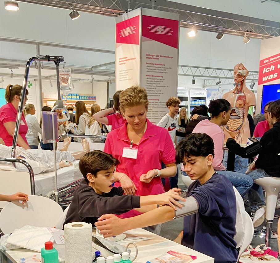 Diese Gelegenheit nutzten viele Eltern, um sich über Gesundheitsberufe und anschliessende Weiterbildungsmöglichkeiten aufklären und beraten zu lassen. Die simulierte Blutabnahme sowie das fachmännische Anlegen eines Verbandes gewährten den Besuchern hautnahe Einblicke in den Berufsalltag.