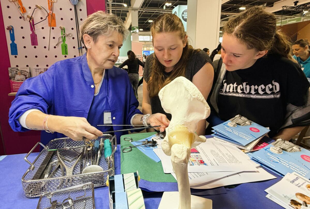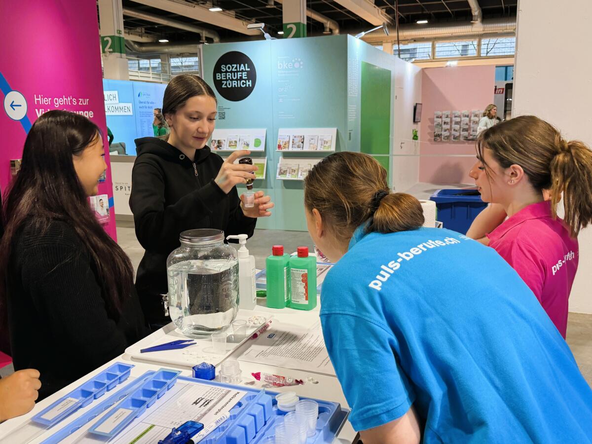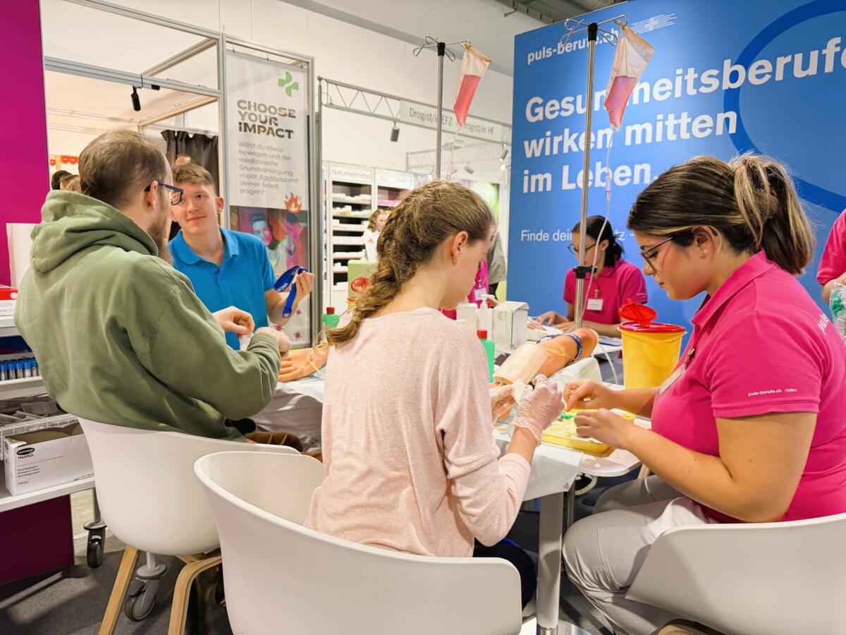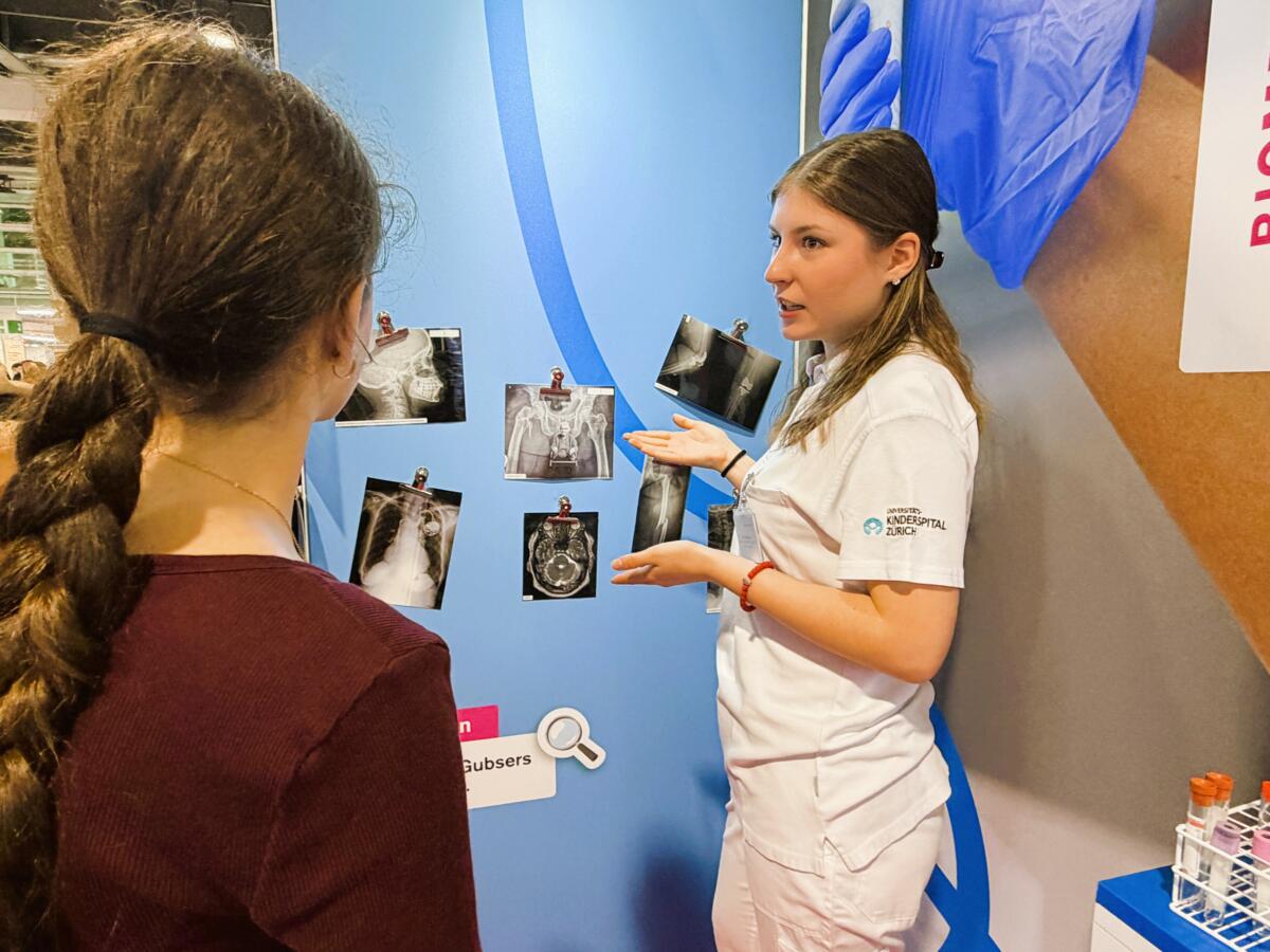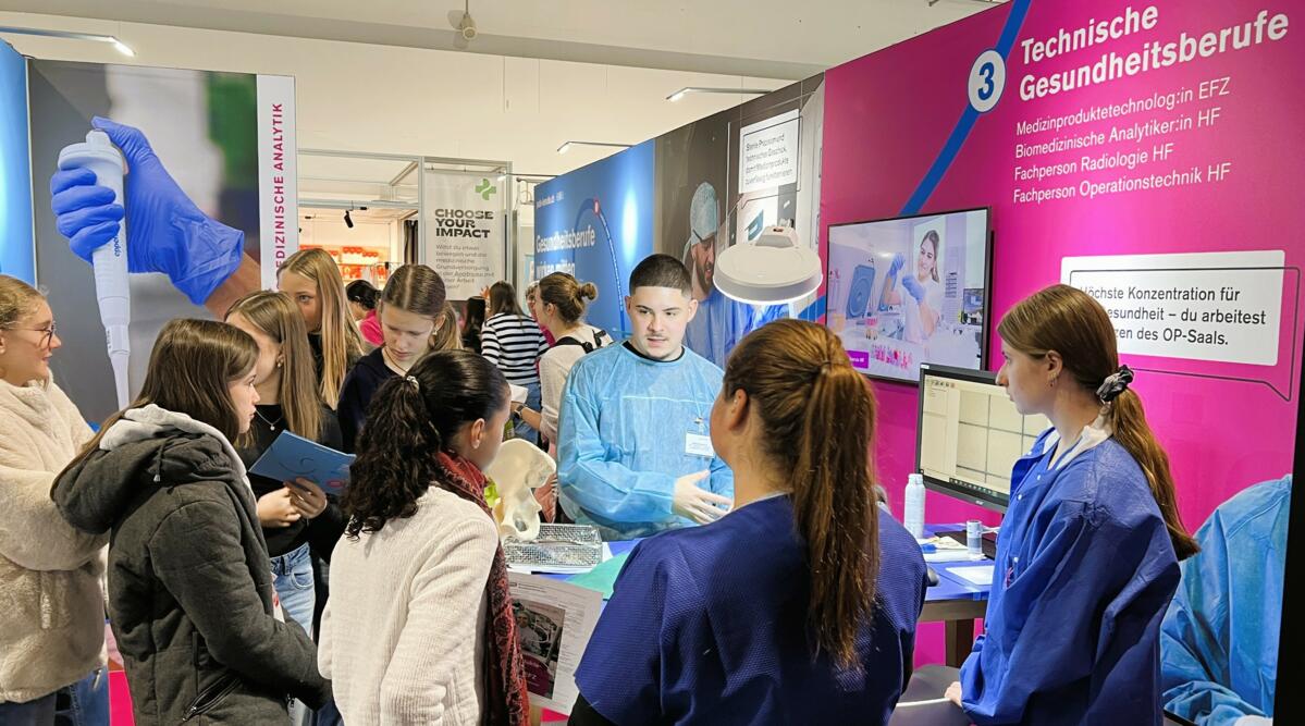 „Welche Diagnose hat Frau Gubser?“ Diese Frage begleitete die Besucherinnen und Besucher durch den Stand. Jugendliche und Erwachsene erhielten an unterschiedlichen Posten hautnahe Einblicke in die Gesundheitsberufe, etwa beim „Umgang mit psychischen Erkrankungen“ oder beim „Getränke eindicken“. Auch die technischen Berufe wie Medizinproduktetechnologe/-technologin EFZ, Fachmann/Fachfrau für med.-technische Radiologie HF, Fachmann/Fachfrau Operationstechnik HF und Biomedizinische Analytikerin/Analytiker wurden vorgestellt. Dort konnten die Gäste unter anderem ein Hüftgelenkknochen betrachten oder erfahren, mit welchen Instrumenten bei Operationen gearbeitet wird.