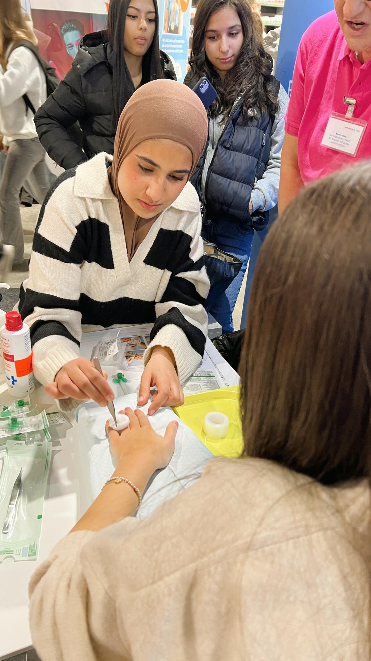 Eine Oberstufenschülerin klebte hochkonzentriert den neuen Wundverband für eine Infusion bei einer FaGe- Lernenden auf den Arm. Ganz in der Nähe untersuchte ihre Klassenkameradin am Stand der Medizinproduktetechnologen verschiedene Operationsinstrumente. Und einen Posten weiter mörserten zwei weitere Schüler fleissig Bonbons, die als Medikamentenersatz dienten.
