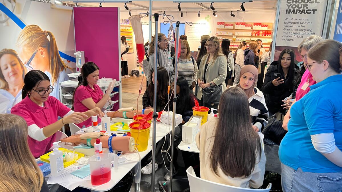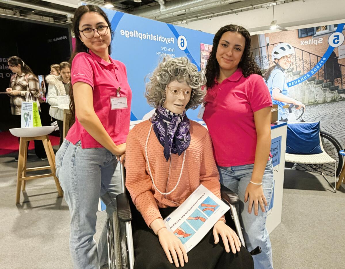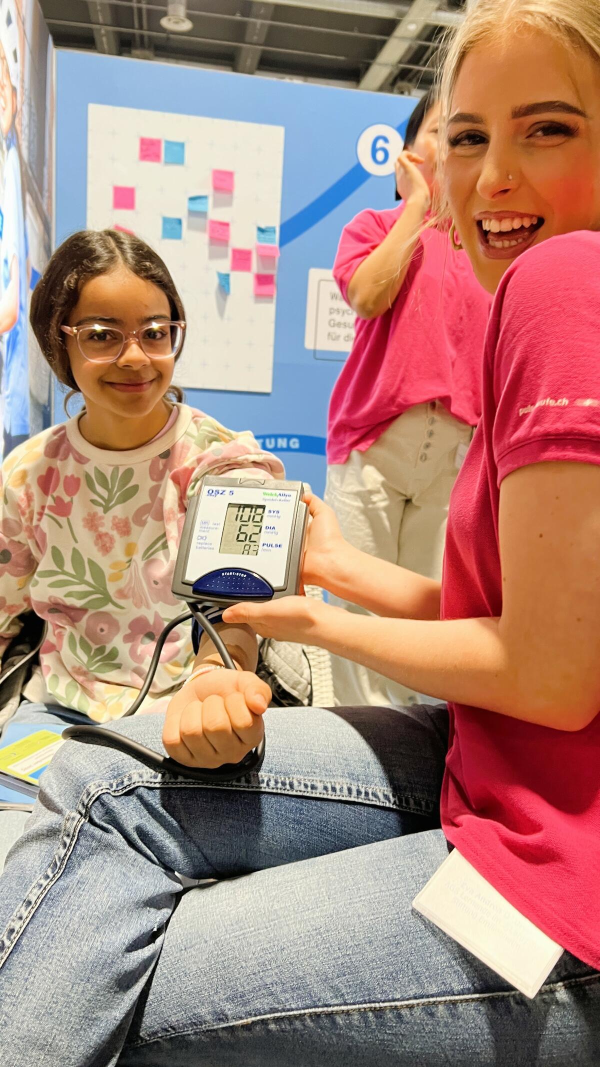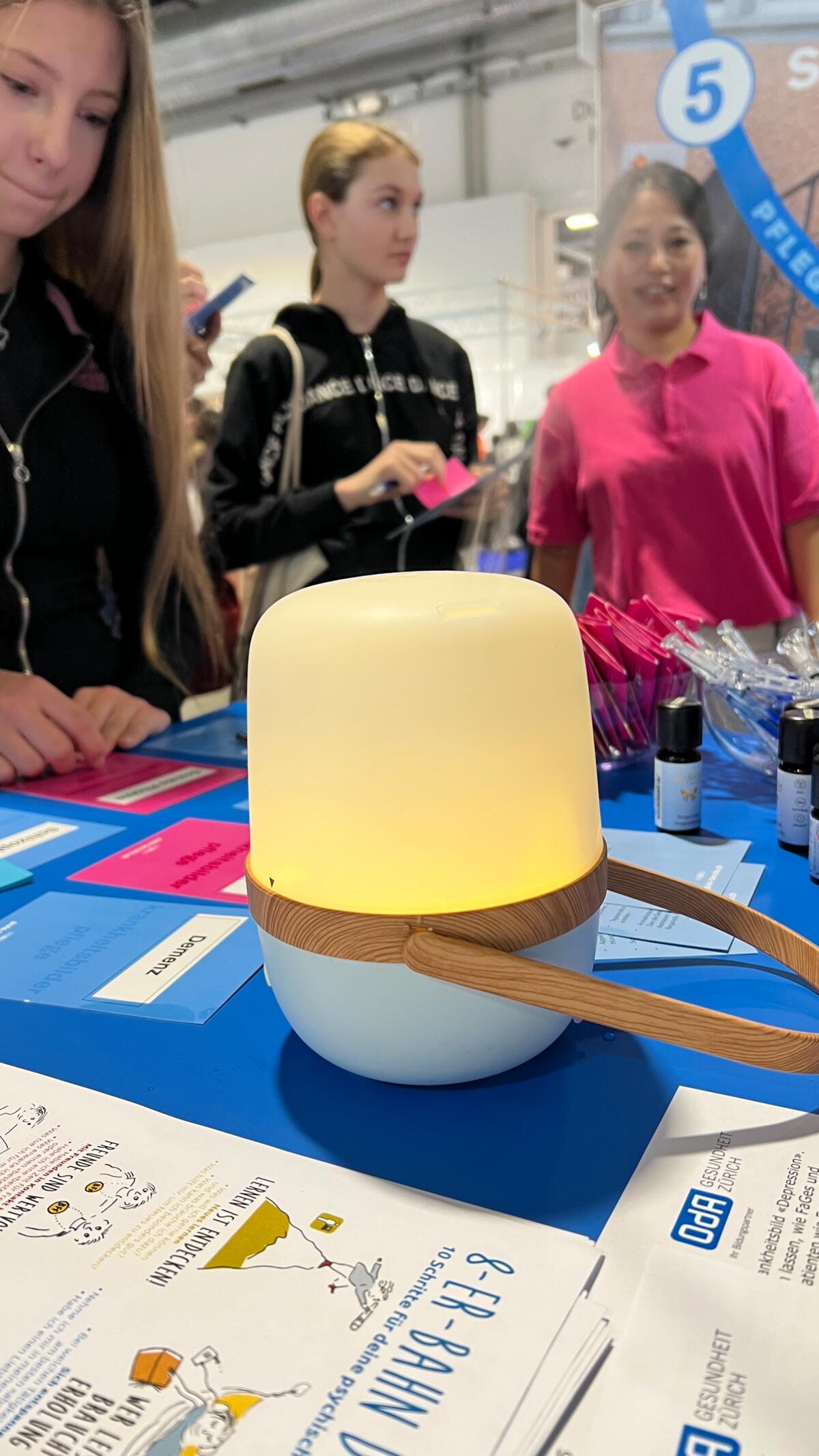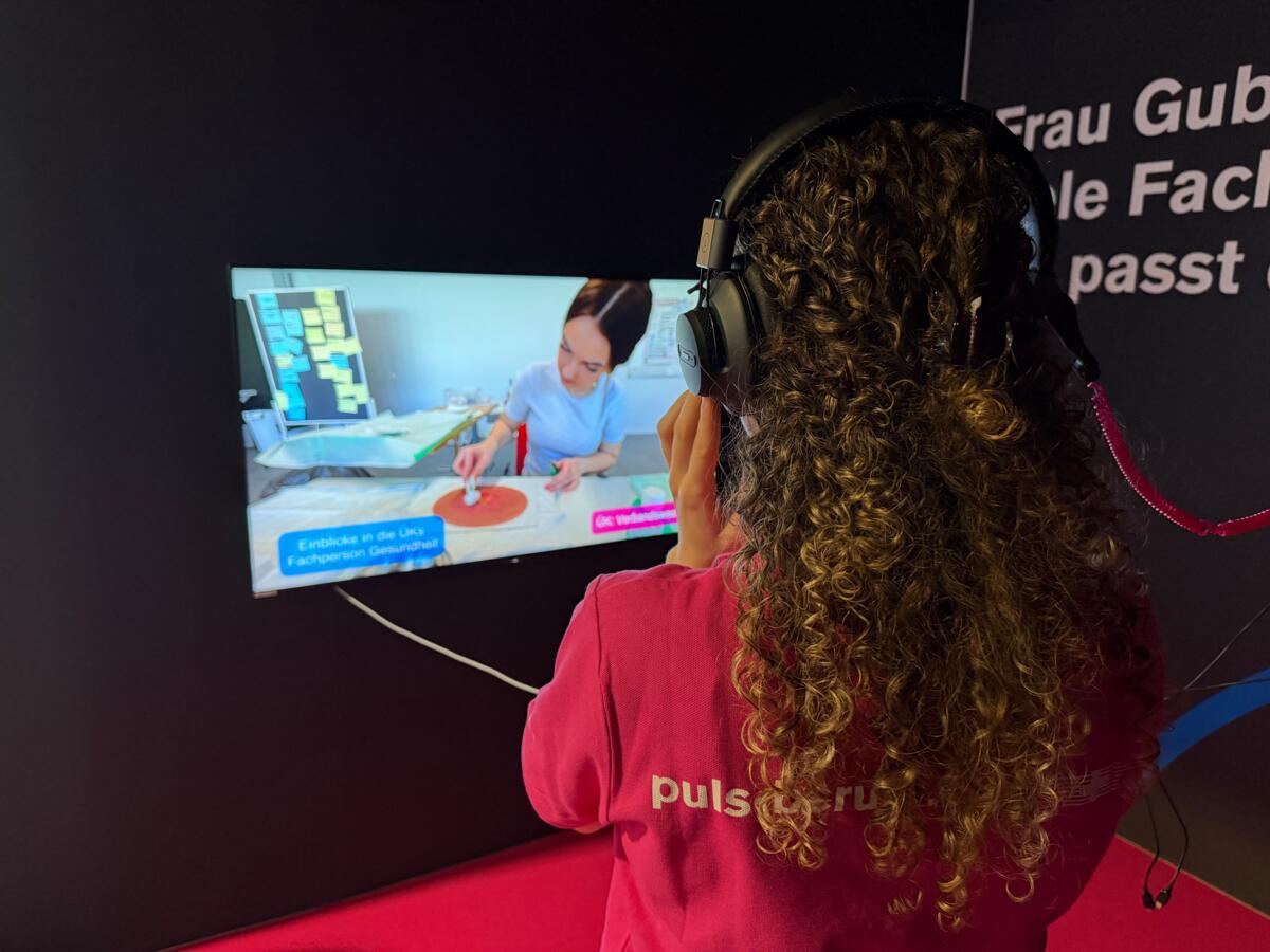 Der Messestand erschien dieses Jahr in völlig neuem Look. Unter dem Dach der Patientinnengeschichte der 89-jährigen Frau Gubser wurden die Besucher:innen kreativ durch die Versorgungsbereiche geführt. Aufgaben mussten gelöst und Hinweise gefunden werden. Gestartet wurde dabei im Spital, wo man als Teil der Geschichte Blut abnehmen konnte. Weiter ging es zu den technischen Berufen, wo es Hinweise zu Frau Gubsers Blutgruppe oder ihr Röntgenbild zu finden gab. Die Geschichte erfüllte das Ziel, die komplexe Welt der Gesundheitsberufe verständlicher aufzuzeigen. Ergänzend konnten die Besucher:innen im neuen Videoraum inspirierende Videos zu verschiedenen Lehrberufen entdecken.