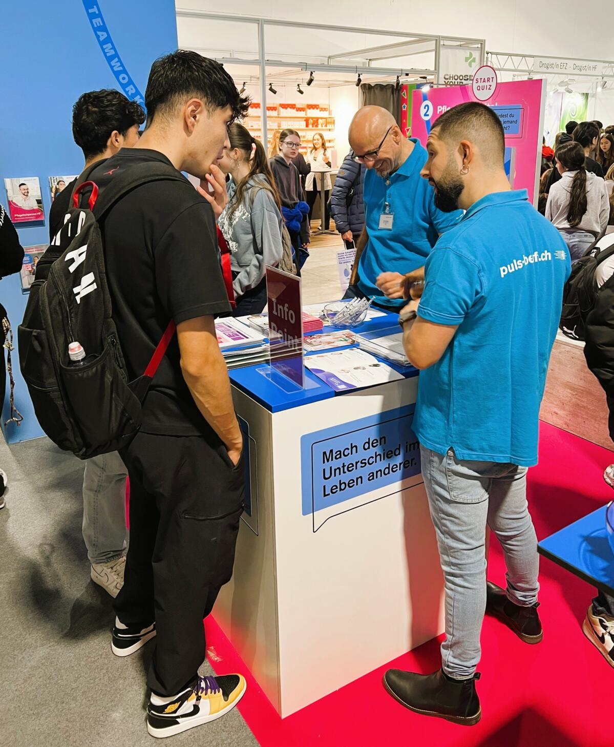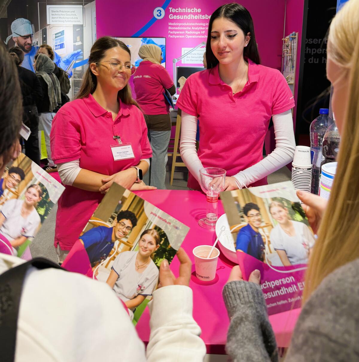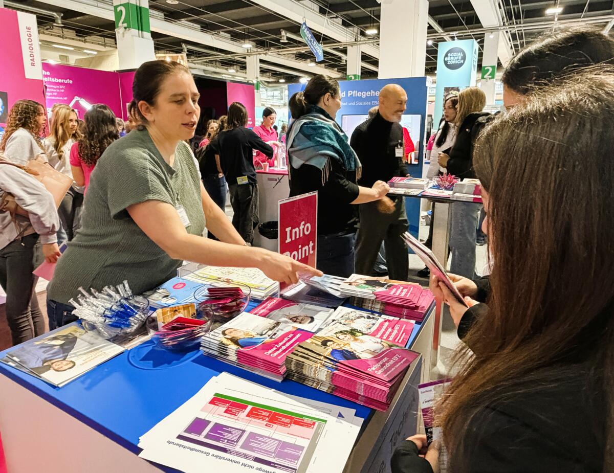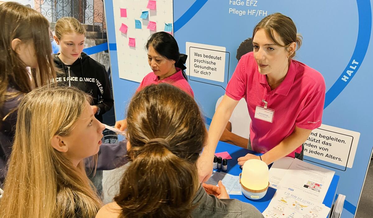 «Ist die Schule schwierig?», «Muss man jedes Wochenende arbeiten?» oder «Brauche ich einen Sek A Abschluss?» waren einige der vielen Fragen, die gestellt wurden. Rund 100 engagierte Gesundheitsprofis und Lernende aus Spitälern, Spitex, Langzeitpflege, der Psychiatrie sowie den Bildungszentren ZAG und Careum und der Laufbahnberatung betreuten den Messestand und erzählten fleissig aus ihrem Berufsalltag.