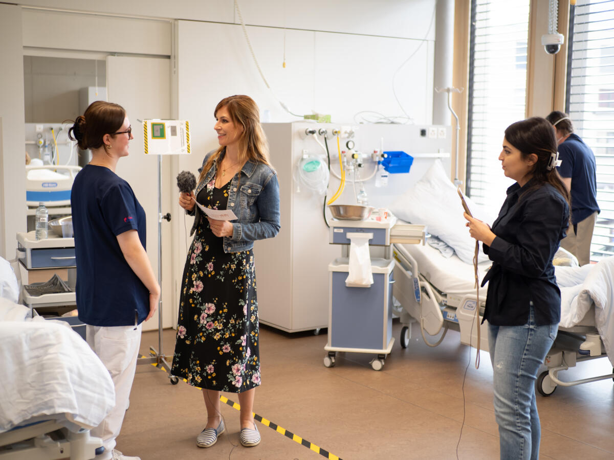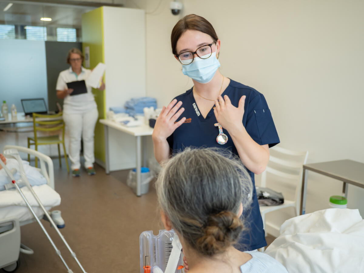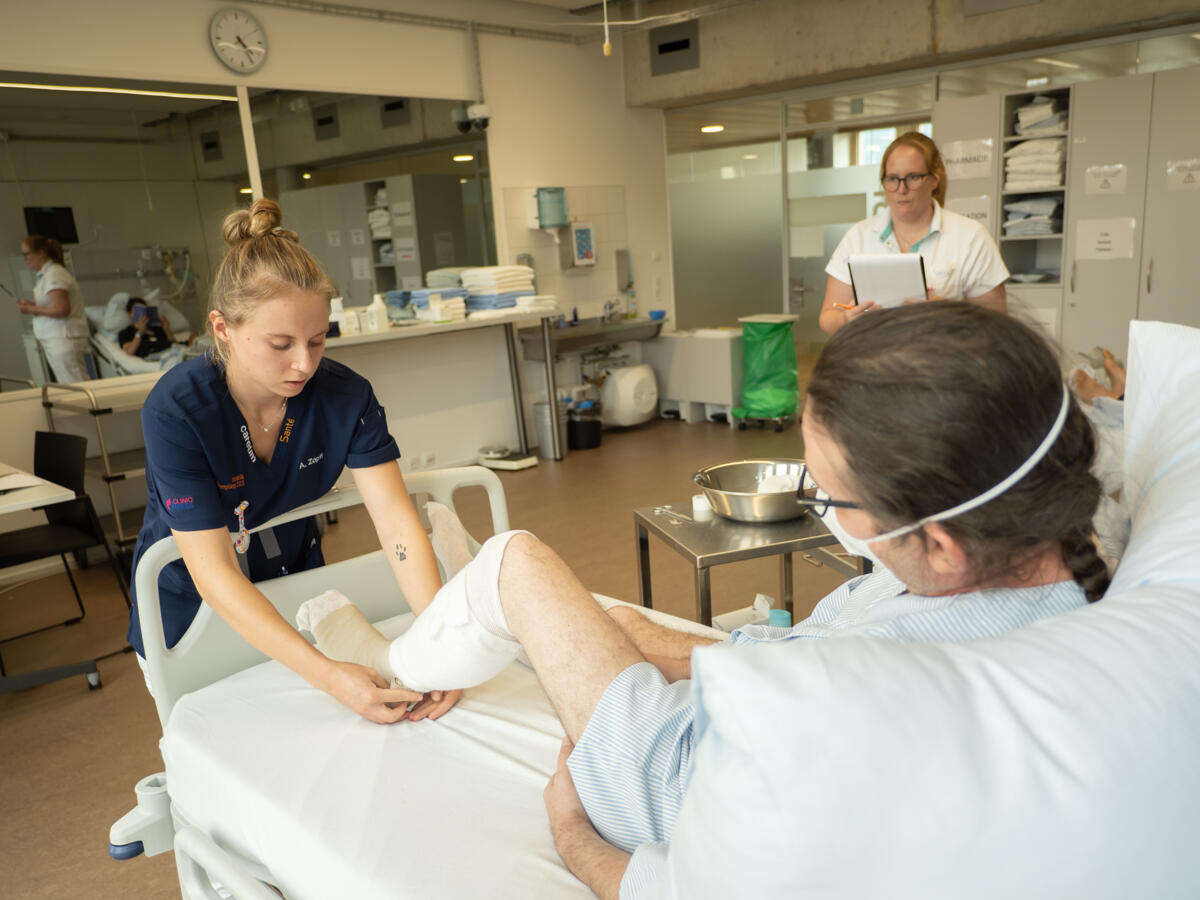 Sie mussten sich während des Wettbewerbs um zwei Klient:innen – phasenweise zur selben Zeit – kümmern. Vor Ort konnte der Wettkampf über eine Projektion auf einer Leinwand verfolgt werden.