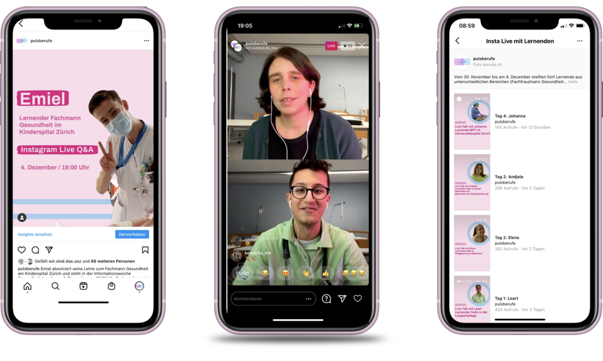 An fünf Abenden in insgesamt sechs Livestreams auf dem Instagram-Kanal von puls-berufe.ch erzählten Lernende im Gespräch mit der Laufbahnberaterin Julia Stahel von ihrem Beruf. Das Publikum konnte dabei aktiv via Kommentare und Frage-Sticker den Lernenden und Julia Stahel ihre Fragen stellen, die live beantwortet wurden. In diesen Live-Talks entstand durch die Fragen der Community ein Dialog auf Augenhöhe.
