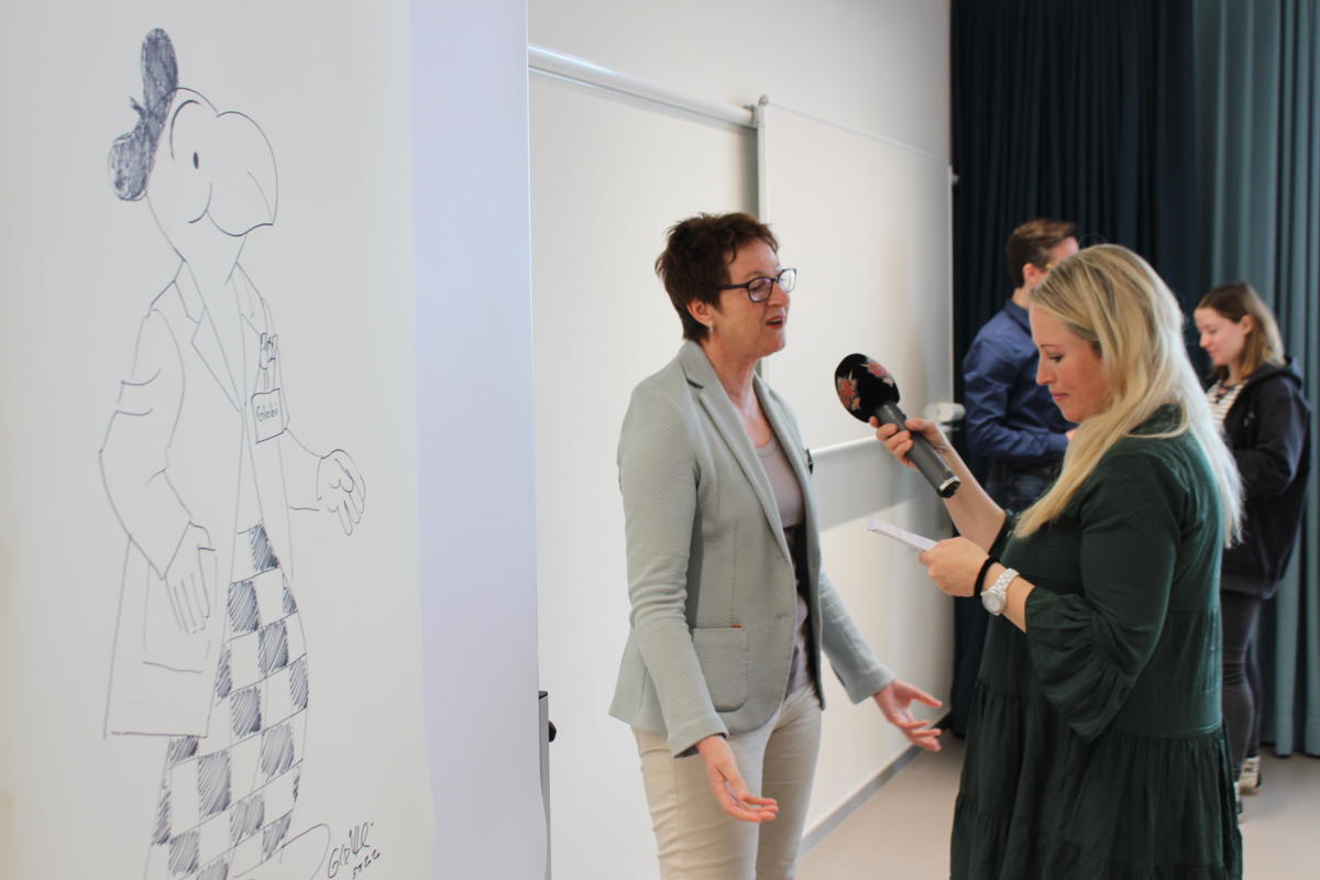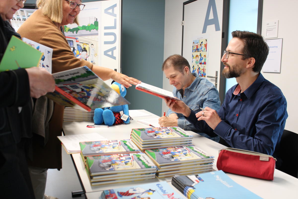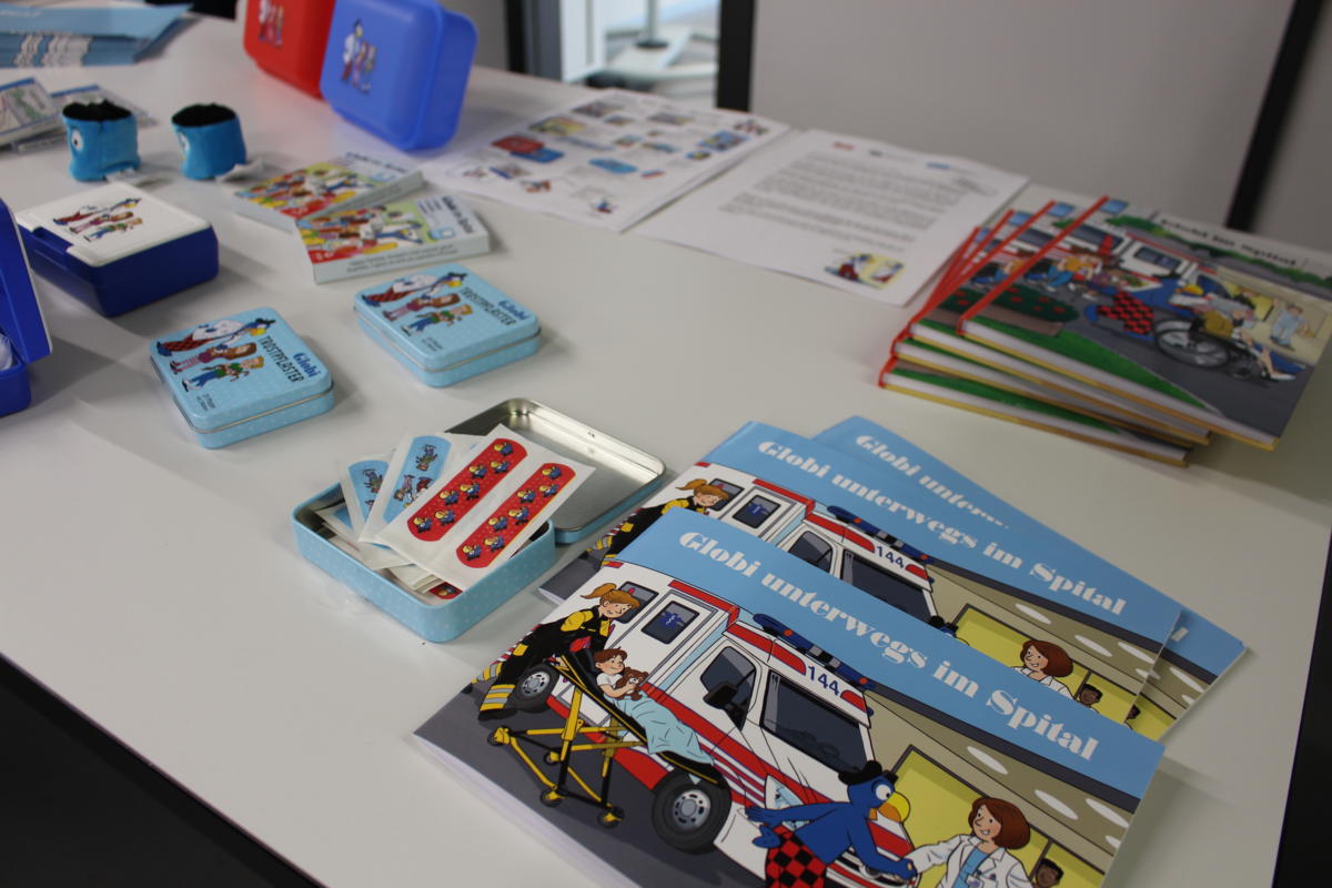Renate Monego, Direktorin der Pflegezentren der Stadt Zürich, begrüsste die Anwesenden zur Medienorientierung und Buchvernissage im Schulungszentrum Gesundheit SGZ. Markus Malagoli, Mitglied des Vorstands der OdA Gesundheit Zürich und CEO des Universitäts-Kinderspitals Zürich, sprach über die Nachwuchswerbung und Gesundheitsberufe. Peter Lehmann, Ausbildungsverantwortlicher der PZZ, äusserte sich zur Idee und Zusammenarbeit mit der OdA Gesundheit Zürich und dem Globi Verlag. Verlegerin Gisela Klinkenberg stellte den neuen Globi-Band vor. Illustrator Samuel Glättli erklärte seine Arbeit am Buch und zeigte, wie er Globi zeichnet.