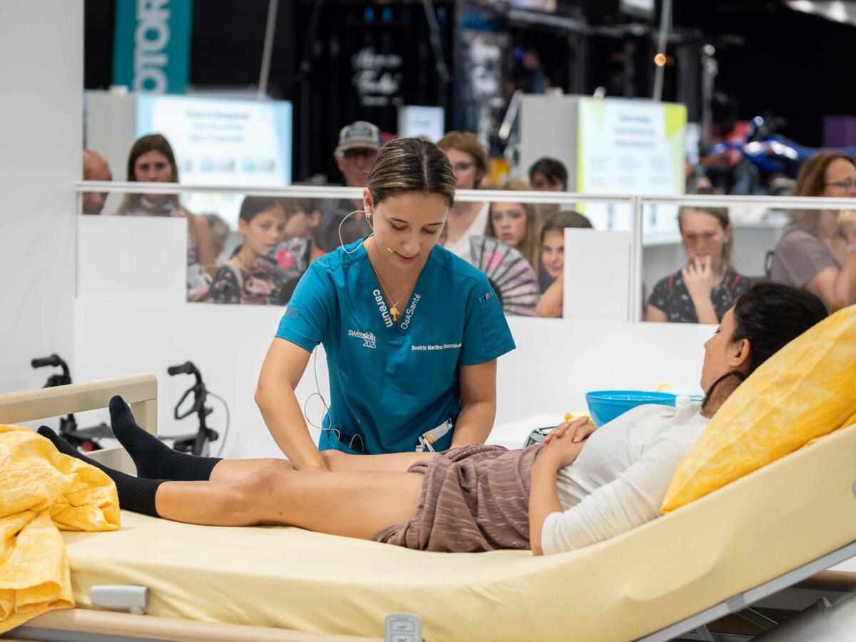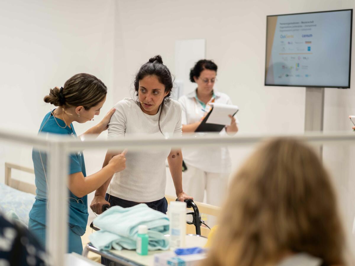 In rund 90-minütigen Prüfungen mussten die Teilnehmenden jeweils zwei Patient:innen betreuen und dabei vielfältige, praxisnahe Aufgaben, wie Körperpflege, Mobilisation, Medikamentenabgabe, Blutentnahme und vieles Weiteres meistern.